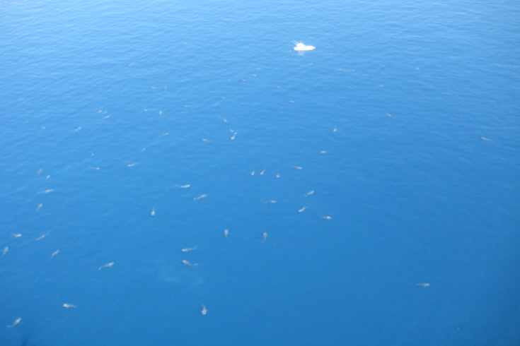 Dr. H.: Whale sharks associate with other tuna species (e.g., yellowfin, blackfin and skipjack) in the fall. Whale sharks work together with the tuna to feed on sardines. Tuna will concentrate the sardines at the surface and whale sharks will position themselves vertically in the water column to feed on the sardines. It is amazing to see a whale shark feeding vertically in the water column. We don’t know how often whale sharks associate with tunas during this time, but there have been days where every large school of tuna that we came across had at least one whale shark in the middle feeding.