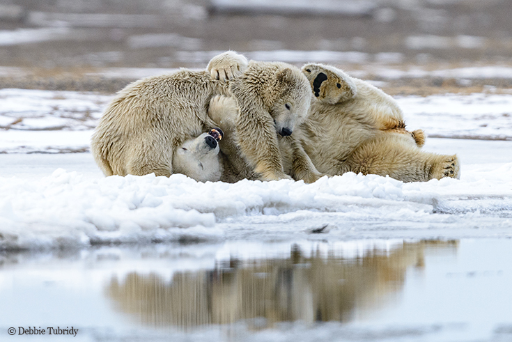 Polar bears communicate through body language, and will often wag their heads from side to side to signal that it’s time to play. Playtime is ritualistic of mock fighting, and the perfect opportunity for polar bears to brush up on their best moves. To initiate play, polar bears will stand up on their hind legs with their front paws at their sides and chins lowered to their chest.