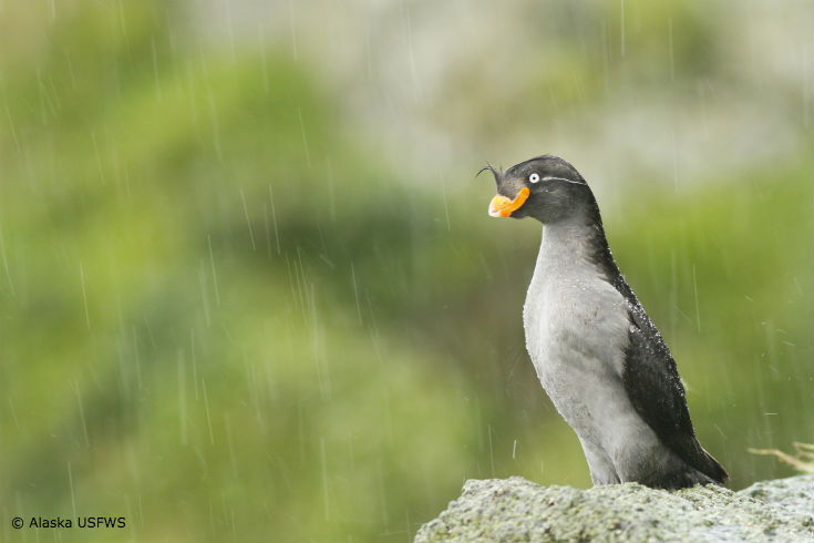 One of the more unusually shaped seabirds, the crested auklet is recognizable by the “crest” of feathers hanging down over its face. Found on the islands and beaches of costal Alaska, crested auklets gather in large colonies to make their nests in crevices of rocks and boulders. They feed in crowds, too; you can see large flocks diving together in deep waters up to 100 feet below the ocean surface.
