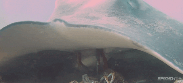 Like manta rays, stingrays are native to tropical and subtropical waters, but have the ability to live in both saltwater and freshwater, with the latter found in parts of South America and Africa. They live their lives primarily on the seafloor, partially buried beneath the sand. Stingrays are also solitary but form large groups, called schools, during migration. Instead of jumping in the air like manta rays, stingrays visit “cleaning stations,” where they share a symbiotic relationship with smaller fish, like the blue-head wrasse or Spanish hogfish. In return for cleaning the mucus from their bodies, these little fish feast on a smorgasbord of parasites that latch onto the stingray’s body.