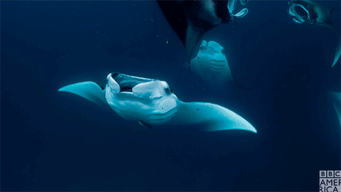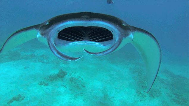 Manta rays are primarily filter feeders or planktivores, but they also enjoy the occasional small fish. Generally, they prefer zooplankton, buffet-style, where they open their mouths wide and consume huge quantities. While manta rays do possess small, cusped teeth—between 918-1,456, in fact—they are not used for eating, but for mating. Sharks and orcas are predators of the manta ray and you can sometimes spot scars from attacks, but like sharks, manta rays have an electrosensory system consisting of hundreds of electroreceptive organs, referred to as the ampullae of Lorenzini, which help them sense other organisms in their environment using electrical fields and prepare for an attack if necessary.