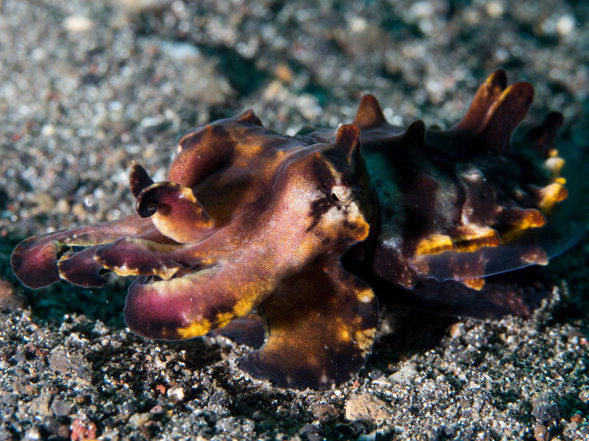 Unlike many of its relatives, the flamboyant cuttlefish prefers to “walk” along the seafloor rather than swim. It uses two arms and fins to make leg-like appendages to quietly creep across the seafloor. This behavior, called ambling, is only seen in one other cephalopod—the paintpot cuttlefish.