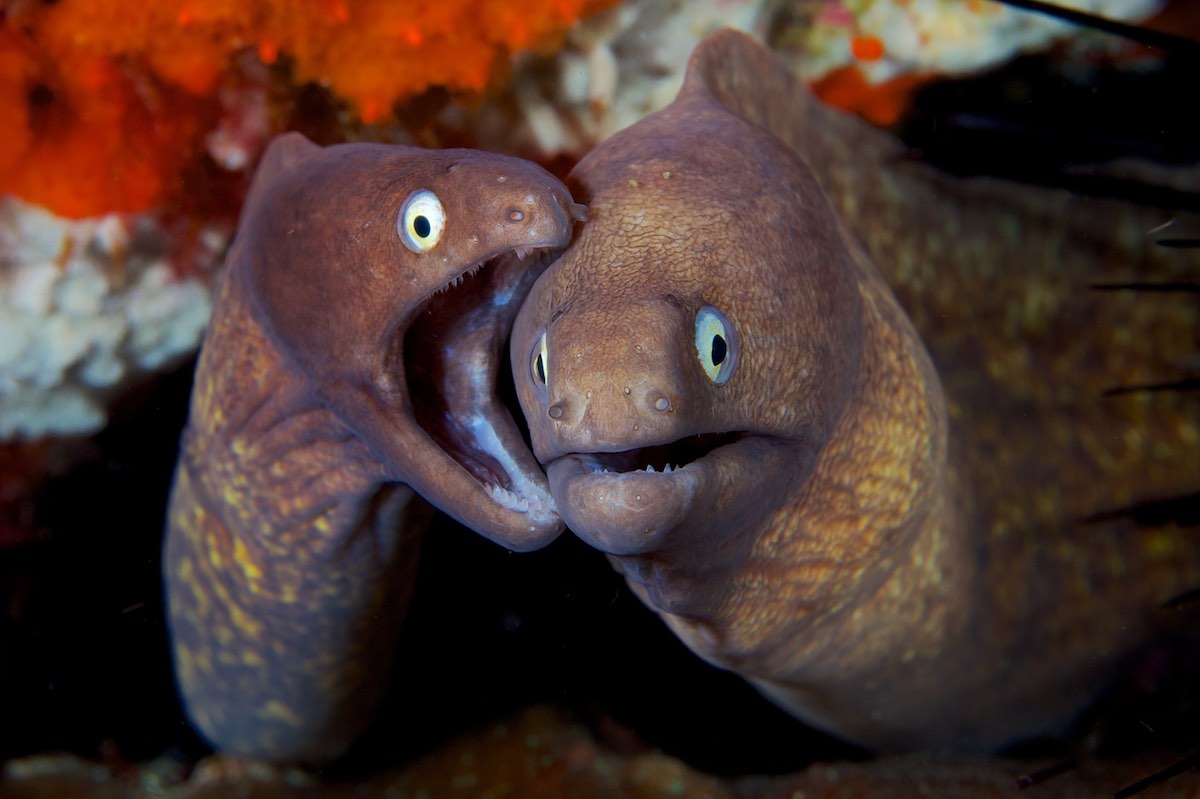 Eels have strong jaws and a series of small, sharp teeth (trust us, you do not want to be bitten by a big eel—check out this story of a run-in with a moray eel). Don’t worry, though, your odds of being attacked by an eel are low, they’re mostly nocturnal and prefer to stay hidden in the sand and rocks.