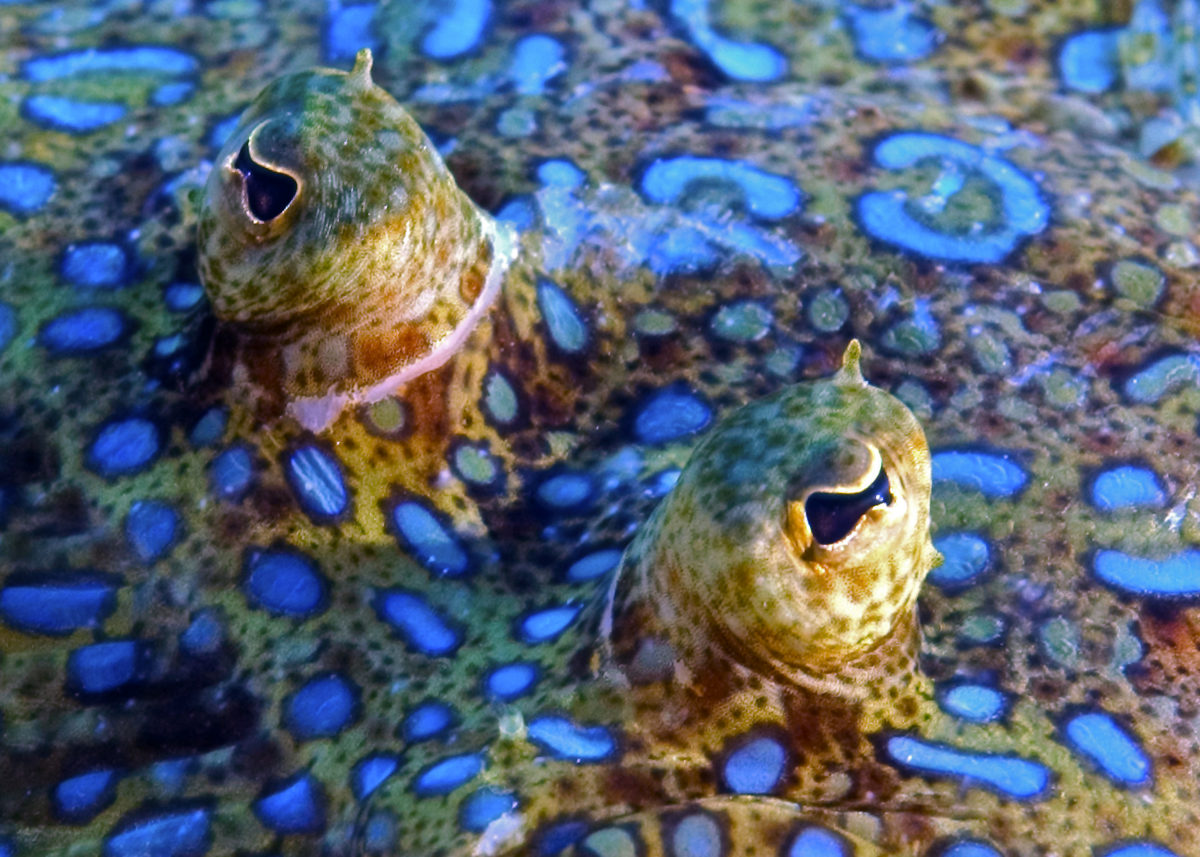 Finally, there are a few ocean animals that are outside the box when it comes to symmetry. Some sponges are asymmetrical, which means they have no symmetry. Another fun exception is what we call flatfishes—they start life out as larvae with bilateral symmetry but grow up into adorably asymmetric adults. Because flatfishes spend most of their lives with one side of their bodies flat against the seafloor, they’ve decided to go rogue on symmetry. As flatfish larvae grow, they undergo a dramatic transformation where they flatten out, one side becomes pale, and one eye migrates over to the other side of the head.