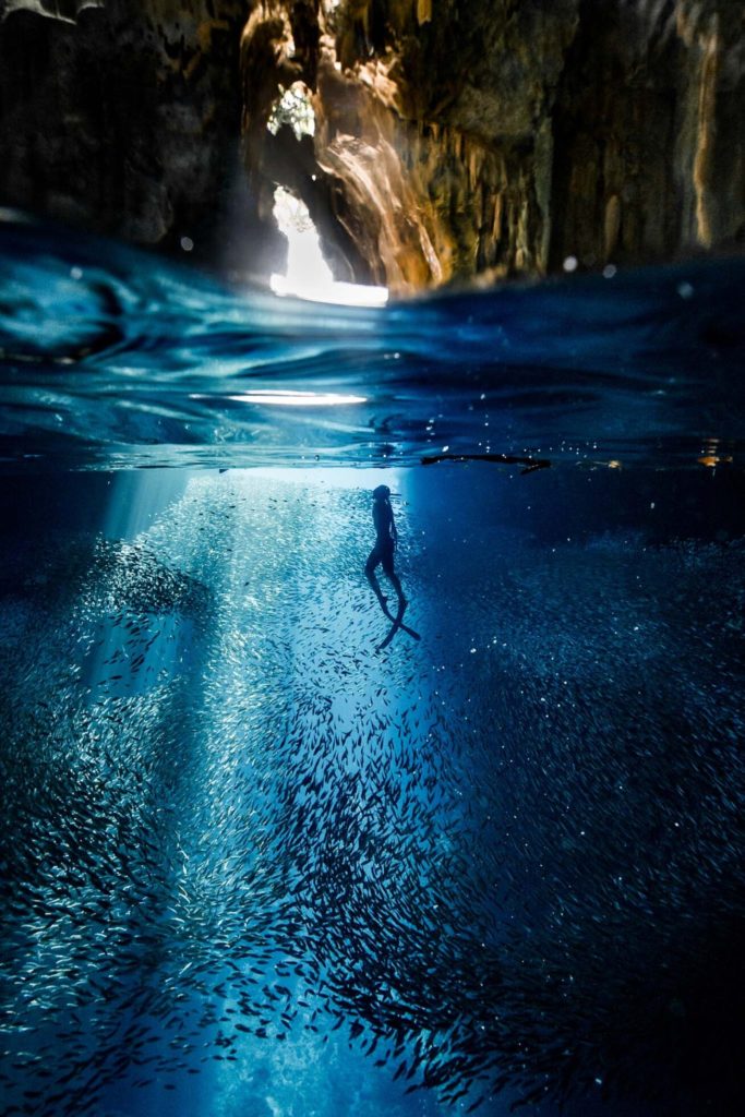 This is such an amazing photo, framing this one moment in time that melds the Earth above with the sea below, the human diver coming up for air while the school of fish carries on below. The lighting and composition really bring it all together, and it tells me such a story of interconnectedness between our world above and their watery world below. Even the angling of the light, as it expands from a small point above, to a wider angle below, really highlights the vastness of the underwater world.