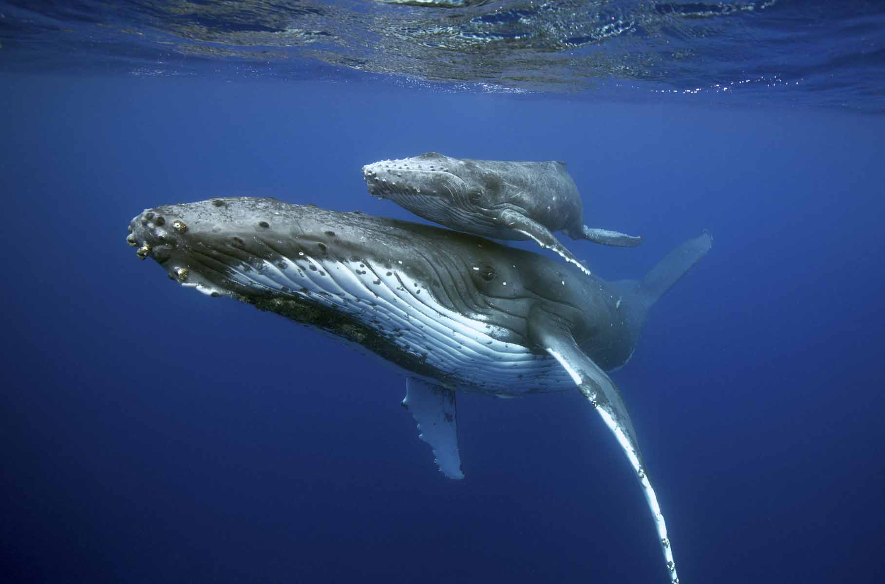 Humpback whales reach sexual maturity between four and 10 years old, after which females birth a calf once every couple of years. Calves are between 13 and 16 feet long when they’re born and double their length after just one year.