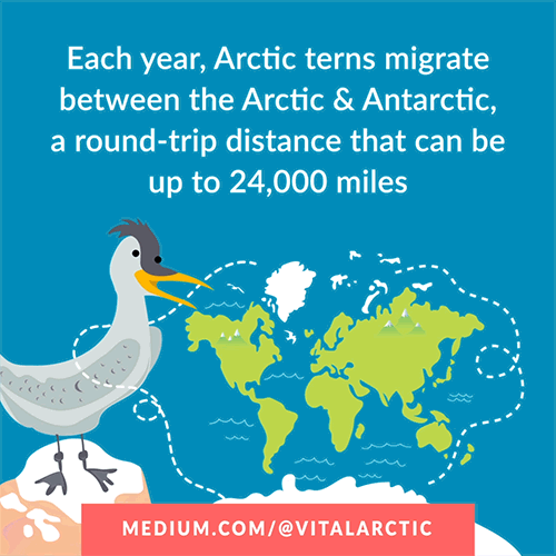While on their record-setting journey, the Arctic Tern spends time in the Bering Strait region. Famous as long-distance fliers, some Arctic Terns may migrate farther than any other birds, going from the high Arctic to the Antarctic. The waters around the Bering Strait provide habitat for nesting and breeding—as well as food and nutrients.