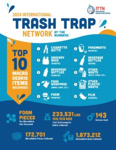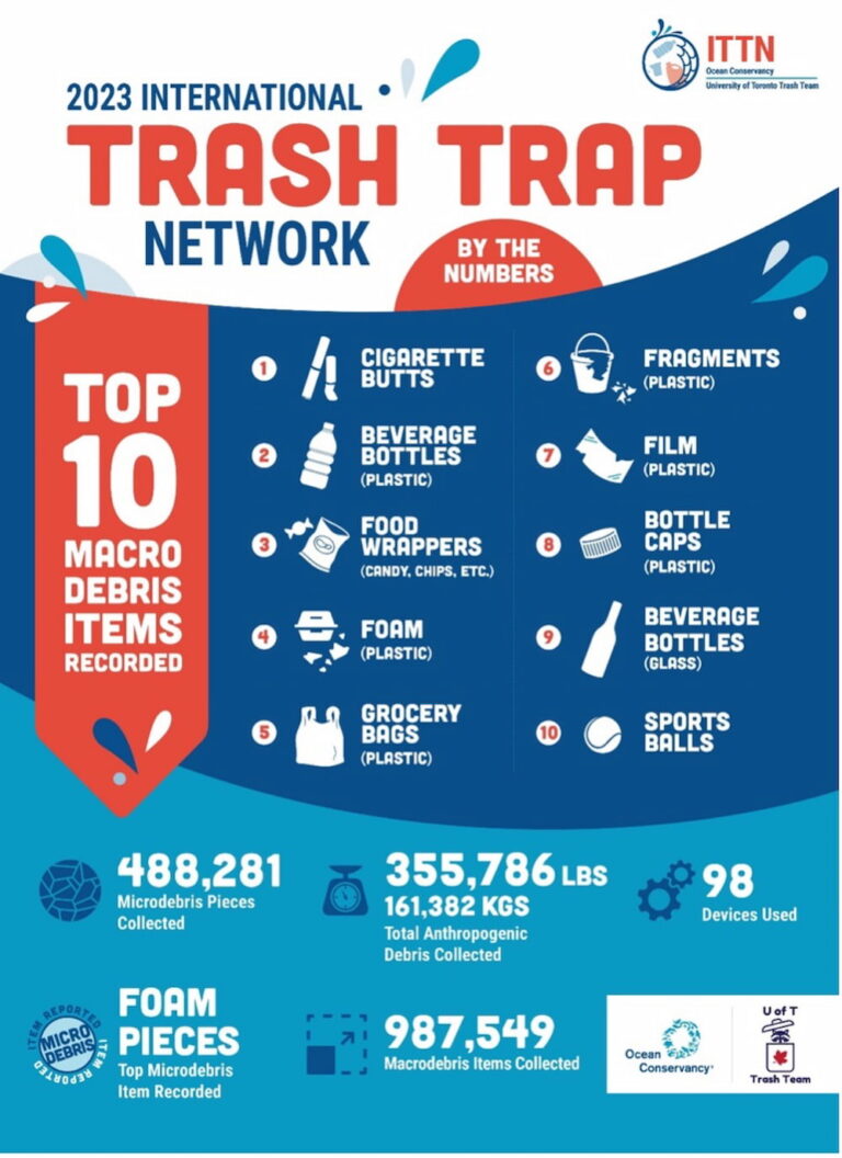The International Trash Trap Network (ITTN), led by Ocean Conservancy and the University of Toronto (U of T) Trash Team, connects hundreds of local groups around the world through one global network, all using trash traps to increase cleanup efforts. The ITTN assists local trash trap programs to effectively clean up their local waterways and coastlines, collect harmonized data, engage communities, and inform upstream solutions.